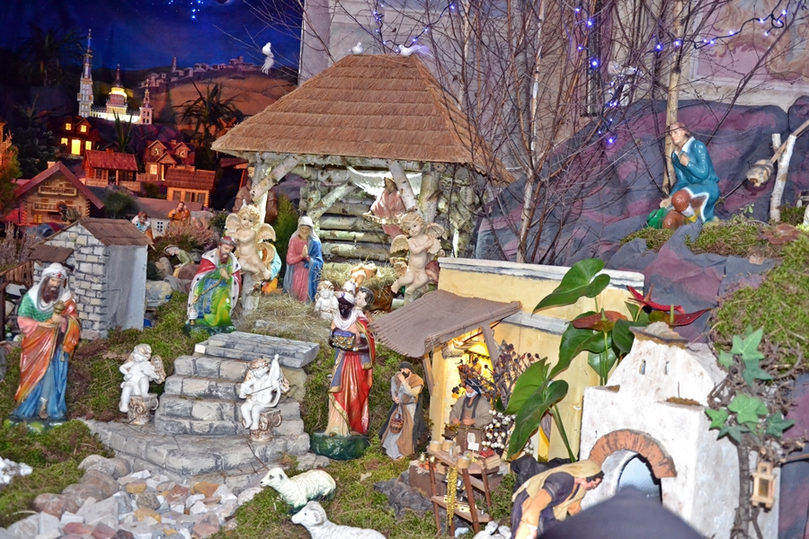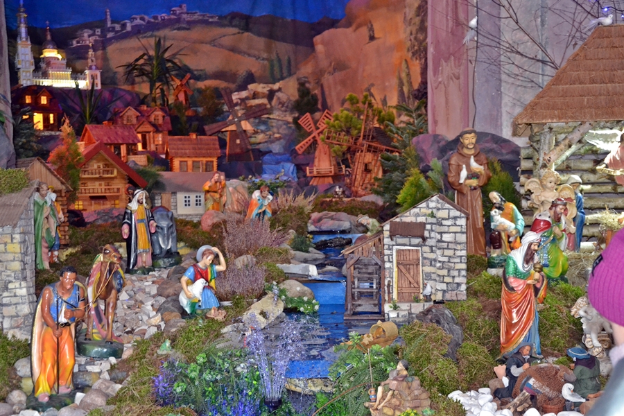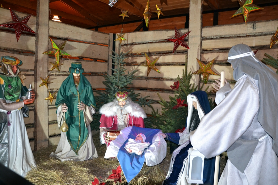 Centralne miejsce w szopce zajmują Jezus, Maryja i Józef. Są w niej pastuszkowie, którzy jako pierwsi znaleźli Dzieciątko Boże i oddali Mu pokłon. Są mędrcy ze Wschodu, którzy przybyli, by złożyć dar wyczekiwanemu przez tysiące lat Zbawicielowi. Na szopkę składa się szereg scenek rodzajowych takich jak: zagroda pasterska, chata, ludzie bawiący się i pracujący, są wiatraki i młyn wodny, gospodyni przygotowująca posiłek i taka, która doi krowę. Jest rolnik, który orze pole, ale i siewca, który idzie, by je obsiać. Ktoś właśnie piecze prosiątko, by przyjąć gości. W oddali pali się ognisko. Płynie woda, jest staw, w którym są żółwie i kaczuszki. W miasteczku nie mogło zabraknąć sklepików. Jest i kościół. Nie brakuje w szopce różnych zwierząt. W szopie, na sianie, leży Boża Dziecina, na którą z troską i miłością spoglądają Maryja i Józef. Miasteczko tętni życiem, a jego mieszkańcy zajęci swoim sprawami nie dostrzegają, że tuż obok ich domostw narodził się Zbawiciel. Sceny z szopki cieszą oczy swoim dynamizmem, ale skłaniają także do refleksji, byśmy nie zagubili w pośpiechu i pędzie życia tego, co najważniejsze.