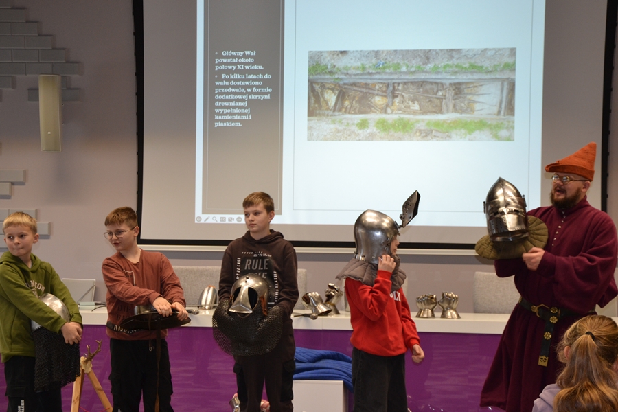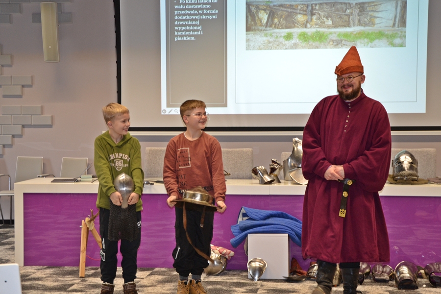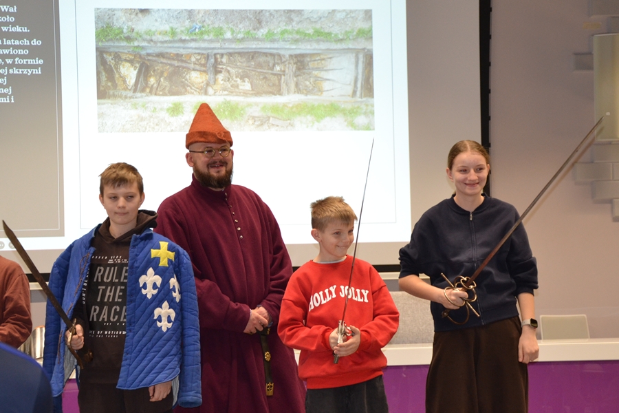 Z Warty pojechaliśmy do Spycimierza, niewielkiej miejscowości, która słynie z układania dywanów kwietnych na uroczystość Bożego Ciała. W 2021 roku zostały one wpisane na Listę reprezentatywną niematerialnego dziedzictwa kulturowego ludzkości UNESCO. Część z nas miało okazję już zwiedzić wcześniej to muzeum, ale tym razem mogliśmy uczestniczyć w wyjątkowym zwiedzaniu odbywającym się w ramach spotkania „Spycimierskie historie”. Naszym przewodnikiem po tych pasjonujących historiach był p. dr Jędrzej Kałużny, dyrektor Centrum. Z zaciekawieniem wysłuchaliśmy opowieści o historii Spycimierza, o kasztelanach spycimierskich oraz o tym, jak zmieniała się zbroja rycerska w średniowieczu. Pan Jędrzej zaprezentował nam uzbrojenia średniowiecznych rycerzy. Była okazja do przymierzenia poszczególnych elementów zbroi. Chętnych oczywiście nie brakowało. Był też czas na chwilę zabawy i spróbowania swoich sił we władaniu mieczem.
