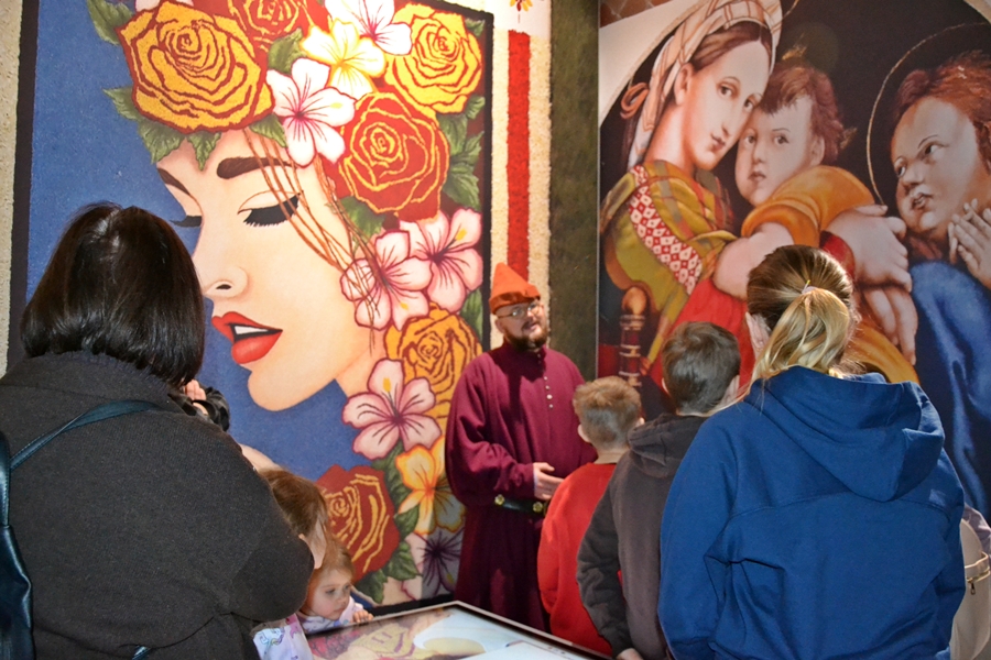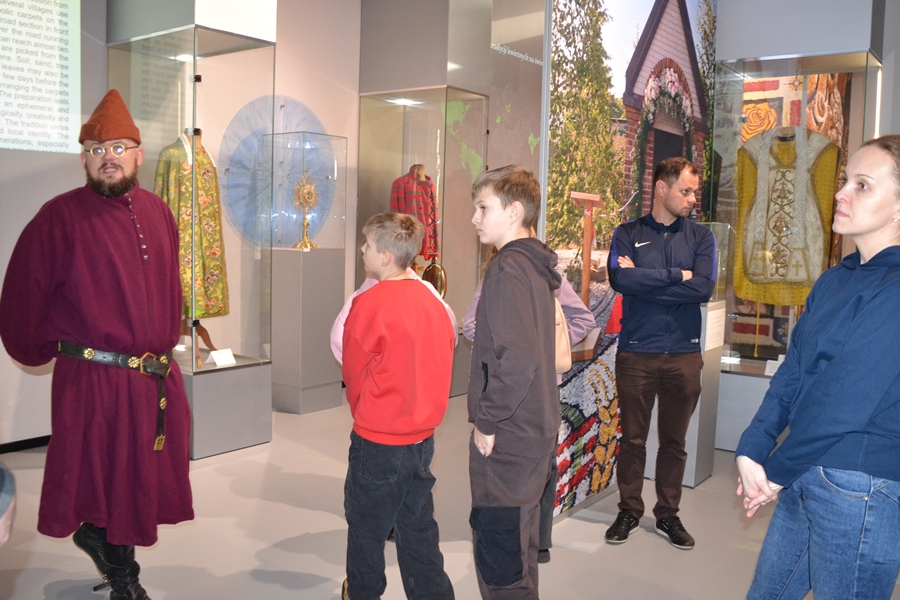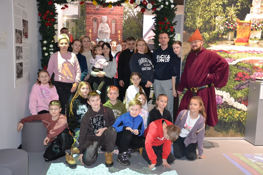 Następnie przeszliśmy do sali poświęconej niematerialnemu dziedzictwu kulturowemu. Pan dyrektor zwrócił naszą uwagę na wielość i różnorodność tradycji. Kwietnym dywanom poświęcona jest jedna z sal Centrum. Tu poznaliśmy historię układania dywanów kwietnych w Spycimierzu. Mogliśmy obejrzeć także dywany kwietne układane w różnych zakątkach świata. Centrum Spycimierskie to bardzo nowoczesne muzeum, to miejsce szczególne, w którym przez dwanaście miesięcy można poznawać bogactwo i różnorodność tradycji z troską przekazywanych czasami przez wiele stuleci z pokolenia na pokolenie.
