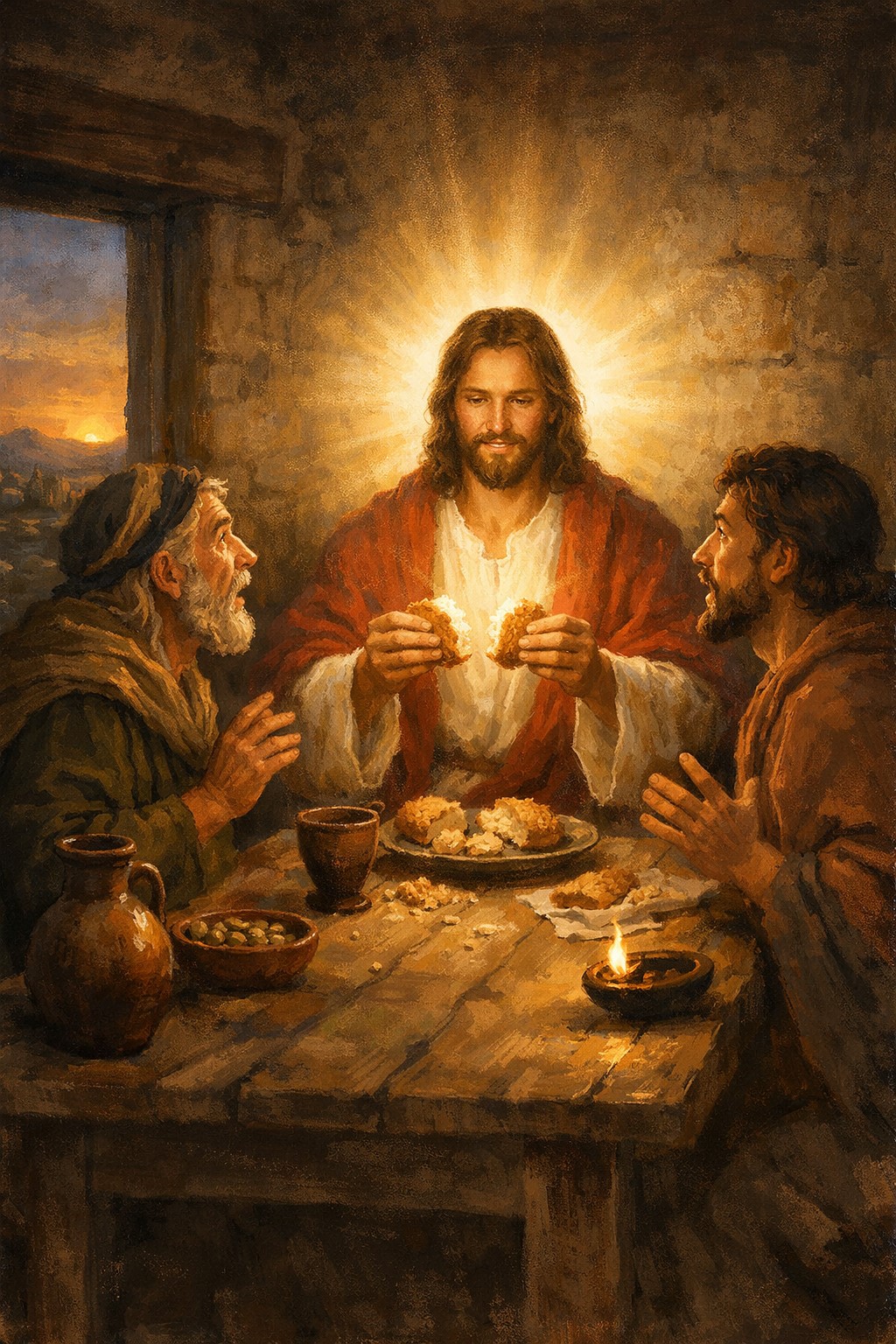 Tak przybliżyli się do wsi, do której zdążali, a On okazywał, jakby miał iść dalej. Lecz przymusili Go, mówiąc: «Zostań z nami, gdyż ma się ku wieczorowi i dzień się już nachylił». Wszedł więc, aby zostać wraz z nimi. Gdy zajął z nimi miejsce u stołu, wziął chleb, odmówił błogosławieństwo, połamał go i dawał im. Wtedy otworzyły się im oczy i poznali Go, lecz On zniknął im z oczu. I mówili między sobą: «Czy serce nie pałało w nas, kiedy rozmawiał z nami w drodze i Pisma nam wyjaśniał?»